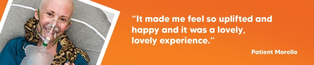 For Morello, a patient at our specialist unit, having a royal python called Jake draped around her neck was a lifelong dream come true. The chance for her to meet and handle the snake happened when former nurse Anna Corwood of Pets and Picasso animal assisted therapy and her menagerie were invited to the hospice for an afternoon to interact with patients, their family members and staff.